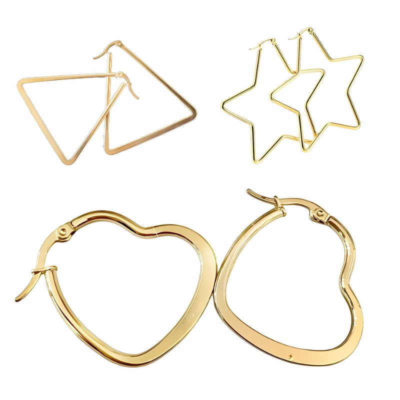 - Los aretes de acero inoxidable dorado están disponibles en una amplia gama de diseños y estilos, distribuidos de manera surtida.