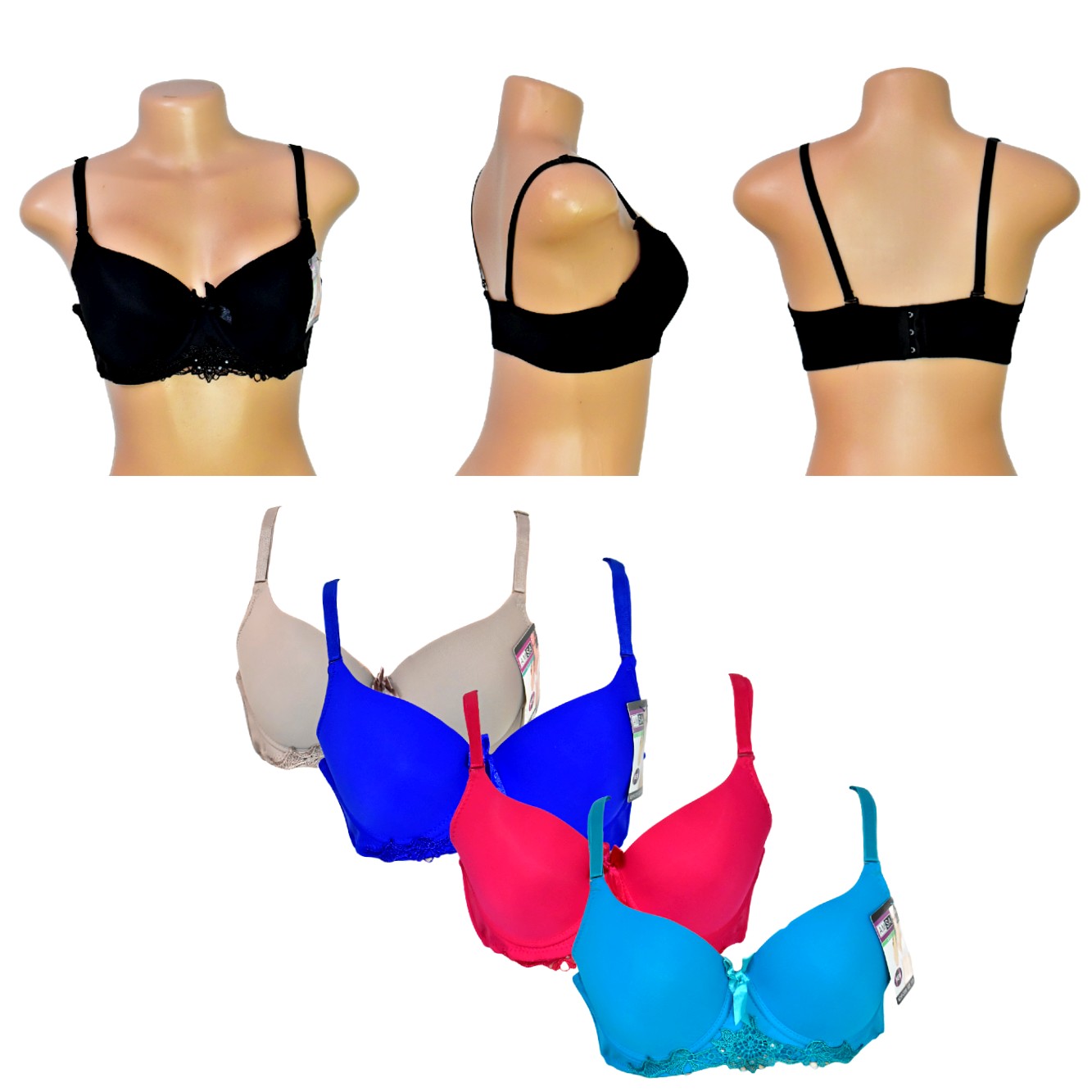 - Distribuido en colores surtidos (Beige, blanco, rosado, azul, rojo, negro) y tallas surtidas (32A, 34A, 36A)