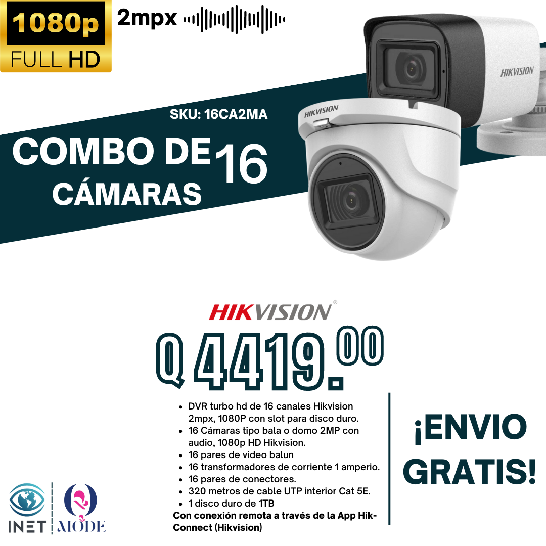 - 2 Cámaras tipo bala o domo 5MP con audio, 1080p HD Hikvision.