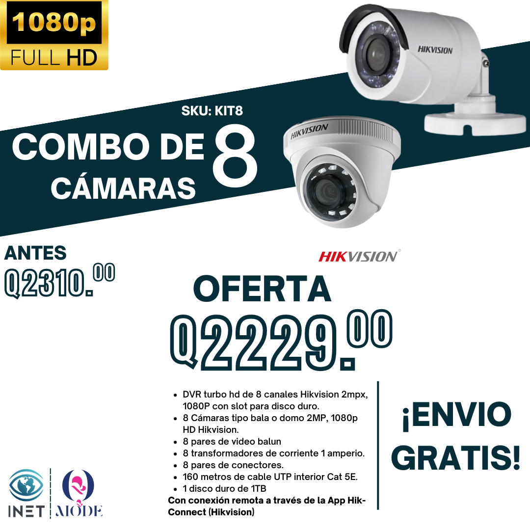 - 8 Cámaras tipo bala o domo 2MP (según disponibilidad) 1080p HD Hikvision.