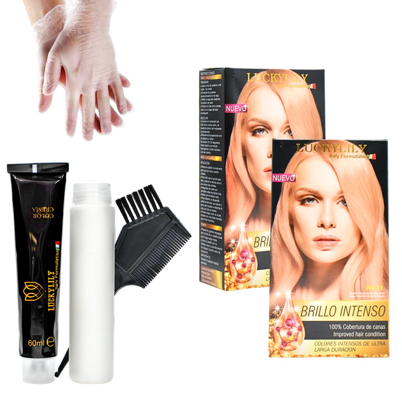 - El producto incluye: crema para mezcla, tinte para mezcla par de guantes y un peine con brocha.